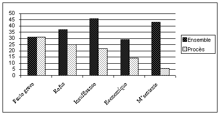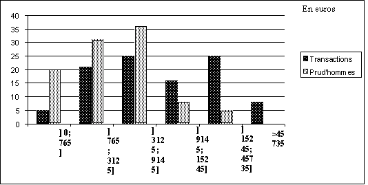 Si nous comparons la distribution des catégories professionnelles dans les transactions de l’enquête, avec celle de la population active (DARES, 2001), c’est au niveau des « extrémités » de l’échelle sociale que l’on note un net déséquilibre entre les populations comparées. Les cadres sont largement sur-représentés, les catégories en bas de la hiérarchie, notamment les ouvriers, sont clairement sous-représentés, tandis que les catégories intermédiaires suivent une répartition homogène dans tous les cas. Or, lorsque nous introduisons comme variable l’existence d’un procès durant la négociation, ce sont précisément ces mêmes catégories professionnelles (cadres et ouvriers), qui connaissent à nouveau les variations les plus grandes. La proportion de cadres perd plus 20% par rapport à l’ensemble des dossiers consultés, celle d’ouvriers en gagne plus de 10%.