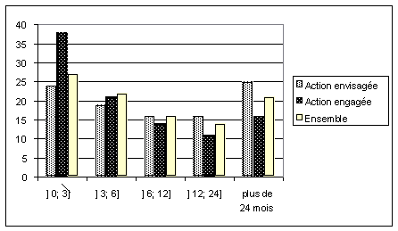 Pour que cette étude des montants négociés soit complète, il semble nécessaire de revenir à l’examen de la variable structurante pour la compréhension du mécanisme de la négociation transactionnelle : peut-on mesurer un impact du « rapport au procès » sur la négociation des montants versés au salarié ? Nous avons distingué, dans le graphique suivant, trois types d’échantillons : les transactions où il est simplement fait mention d’une menace de procès (« action envisagée »), celles où l’accord est intervenu à la suite d’une action effectivement engagée (« action engagée »), enfin l’ensemble des transactions, y compris celles où il n’est même pas fait mention de l’intention du salarié de faire un procès.